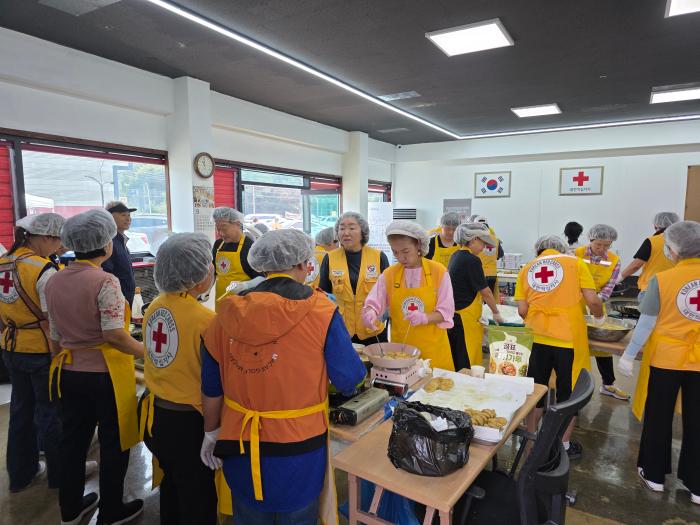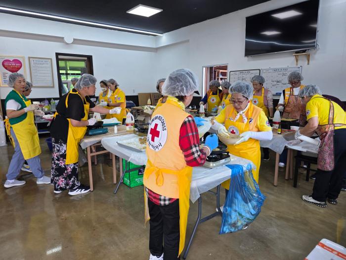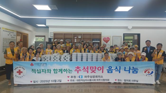 대한적십자사봉사회 파주시협의회(회장 박진숙)는 지난 2일, 파주시 금촌동으로 새롭게 이전한 협의회 사무실에서 ‘2025년 적십자와 함께하는 추석맞이 음식 나눔’ 행사를 개최했다. 이번 행사는 파주상공회의소(회장 박종찬)의 후원으로 진행되었으며, 60명의 적십자 봉사원이 참여해 풍성한 명절 음식을 정성껏 준비했다.