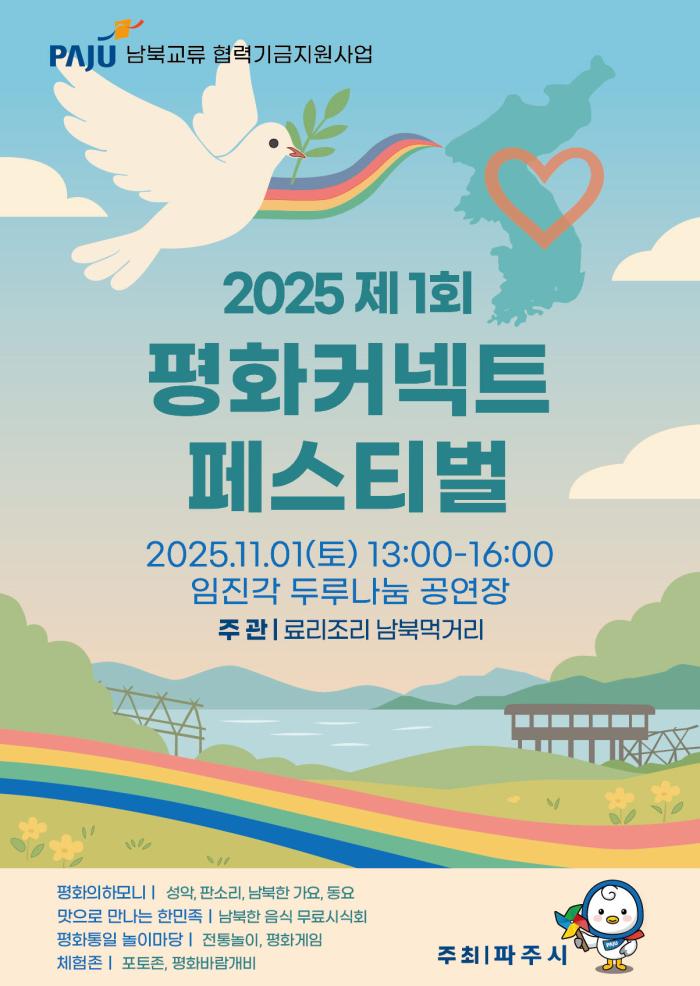 오는 11월 1일(토) 오후 1시부터 4시까지, 임진각 두루나눔 공연장에서 ‘2025 제 1회 평화커넥트 페스티벌’이 개최된다. 이번 행사는 파주시 남북교류협력기금의 지원으로 진행되며, 파주시 마을공동체 ‘료리조리 남북먹거리’(대표 지은영)가 주관한다.