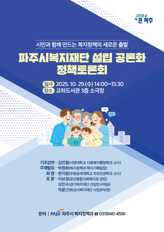 파주시는 오는 29일 14시, 교하도서관 3층 소극장에서 ‘파주시복지재단 설립 공론화 정책토론회’를 개최한다고 밝혔다.
