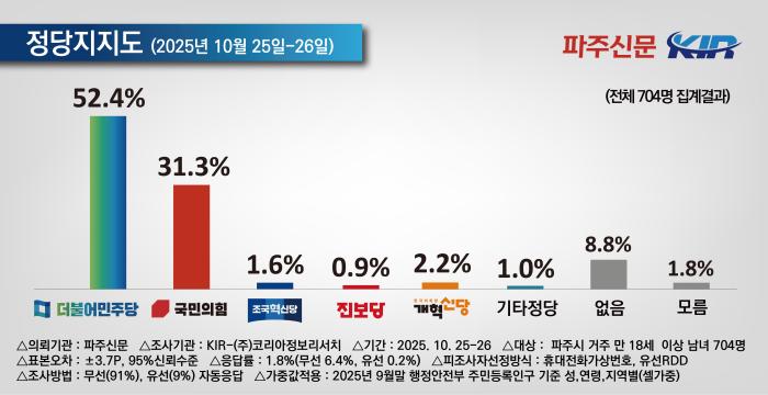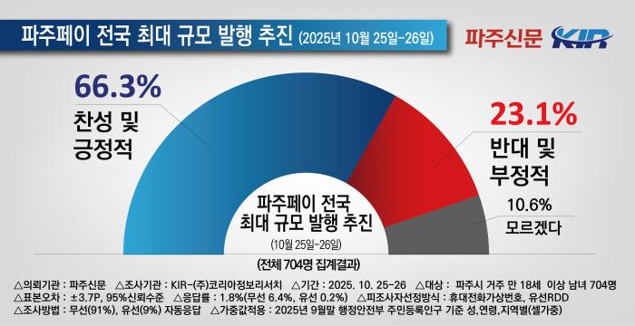 본 조사는 파주신문이 여론조사기관 코리아정보리서치에 의뢰하여 10월 25일, 26일 이틀간 파주시 거주 만 18세 이상 남녀 704명을 대상으로, 무선전화 가상번호(91%)와 유선전화 RDD(9%)를 이용하여 자동응답 방식으로 진행됐다. 응답률은 1.8%(무선전화 6.4%, 유선전화 0.2%)이고, 표본오차는 95%의 신뢰수준에 ±3.7%p다. 통계보정은 2025년 9월 말 행정안전부 발표 주민등록 인구 기준 성, 연령, 지역별 셀가중값을 부여했다. 보다 자세한 내용은 중앙여론조사심의위원회 홈페이지(https://www.nesdc.go.kr)를 참고하면 된다.