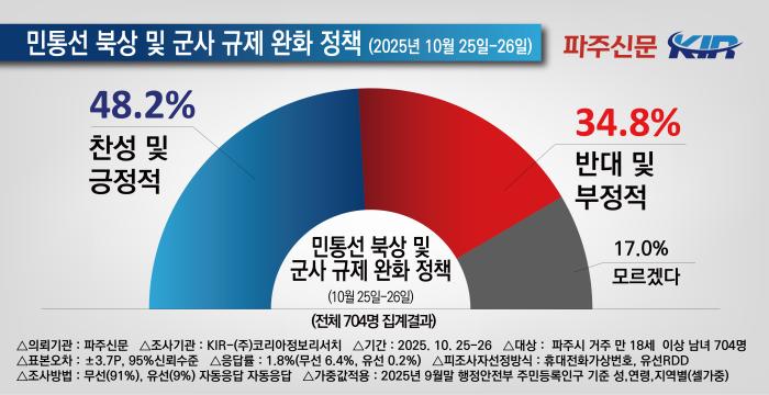 ‘민간인통제선 북상 및 군사규제 완화 정책’에 대해서는 찬성 48.2%, 반대 34.8%, 모름 17.0%로 나타났다. 특히 50대 이상과 민주당 지지층에서는 찬성 비율이 60%를 넘어, 김 시장이 추진하는 균형발전 및 지역경제 활성화 정책에 대한 신뢰가 상당함을 보여준다.