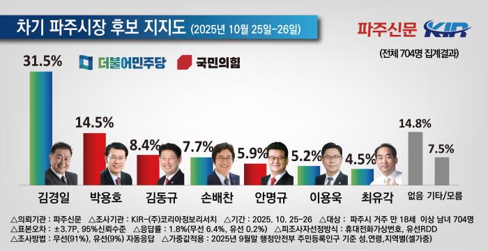 파주신문 의뢰 ㈜코리아정보리서치가 10월 25~26일 실시한 제9회 전국동시지방선거 여론조사 결과, 김경일 현 파주시장이 31.5%의 지지율로 1위를 기록했다. 뒤를 이어 ▲박용호(국민의힘) 14.5% ▲김동규(국민의힘) 8.4% ▲손배찬(더불어민주당) 7.7% ▲안명규 5.9% ▲이용욱 5.2% ▲최유각 4.5% 순으로 나타났다. ‘없음’(14.8%)과 ‘기타·모름’(7.5%)을 합한 부동층은 22.3%로 집계됐다.