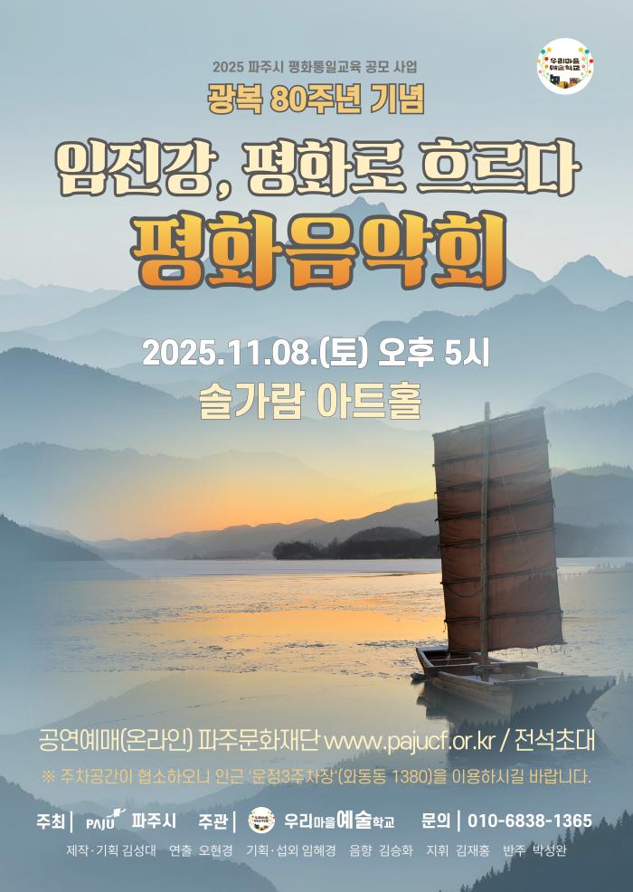 우리마을예술학교(교장 김성대)는 오는 11월 8일(토) 오후 5시 파주시 솔가람 아트홀에서 전석 초대로 광복 80주년을 맞아 분단의 아픔을 넘어 평화 통일의 염원을 담은 특별한 음악회 ‘임진강, 평화로 흐르다’개최한다고 전했다.