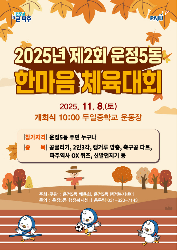 파주시 운정5동은 오는 11월 8일 토요일 두일중학교에서 ‘2025년 제2회 한마음 체육대회’를 개최한다.