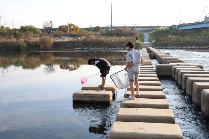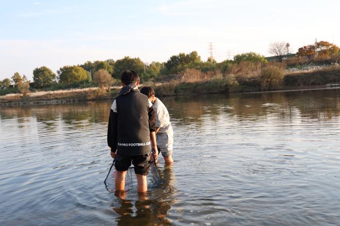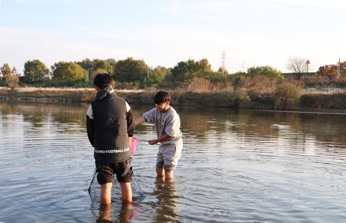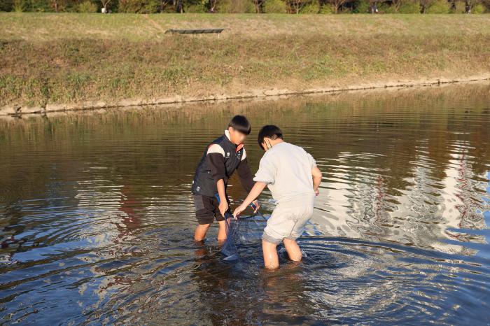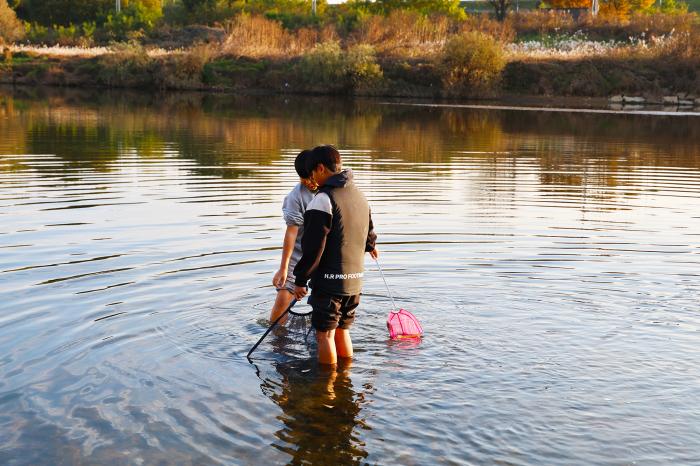 잠자리채와 체험용 반도를 가지고 공릉천에서 첨범첨벙