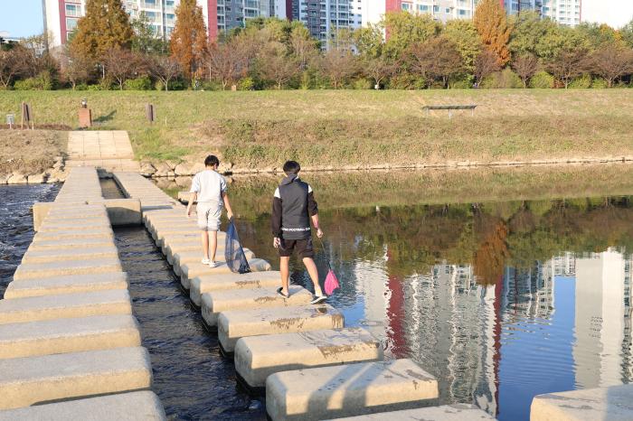 가을 날 이지만 낮기온이 올라가는 따뜻한 햇빛이 비치는 공릉천 금이마을앞 칠간다리에서 만난 아이들