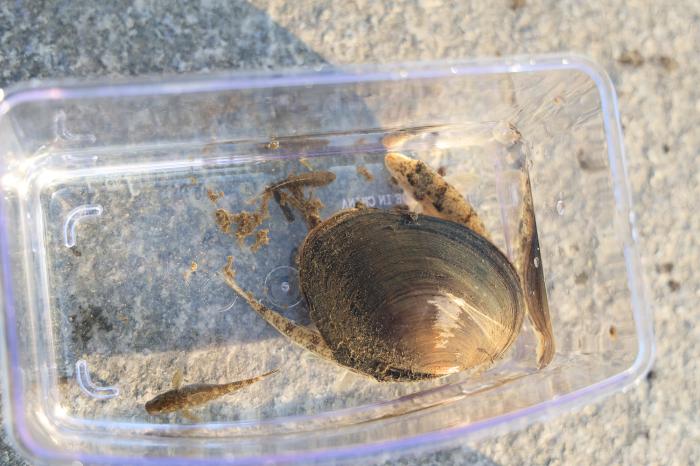 아이들 조과통에는 말조개와 모래무지가 잡혀있다. 방금 아이들이 잡아둔것이렷다.