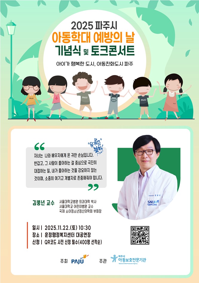 파주시는 ‘아동학대예방주간’을 맞아 오는 22일 10시 30분 운정행정복지센터 대공연장에서 ‘파주시 아동학대 예방의 날 기념 토크콘서트’를 개최한다고 밝혔다.