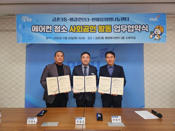 협약에 따라 금촌3동은 대상자 발굴 및 행정적 지원을 담당하며, ‘비클린153’은 전문 장비와 기술을 활용해 생활가전 청소 서비스를 무상으로 제공한다. 또한 ‘한마음희망나눔센터’는 가정용 청소용품 꾸러미를 무상으로 지원할 예정이다.