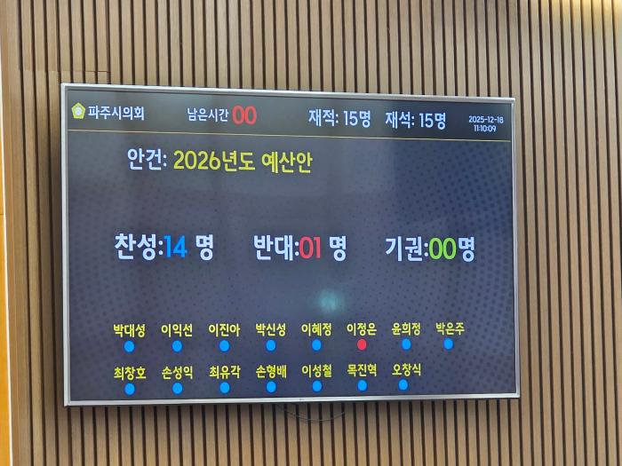 이에 따라 2026년도 파주시 본예산은 당초 시가 제출한 2조3천599억6천여만 원에서 2조3천503억3천여만 원으로 조정됐으며, 찬성 14명, 반대 1명으로 가결됐다.