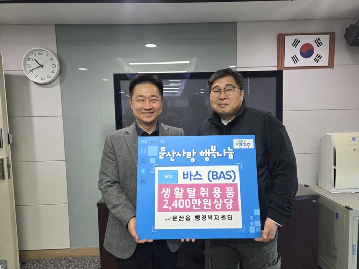 먼저, 생활용품 제조기업 바스(BAS)는 18일 섬유탈취제, 곰팡이 제거제, 과일·야채 세정제 등 2,400만 원 상당의 생활용품을 문산읍에 기탁했다. 이번 기부 물품은 위생 환경 개선이 필요한 취약 가구와 복지 사각지대 가구에 전달될 예정이다.