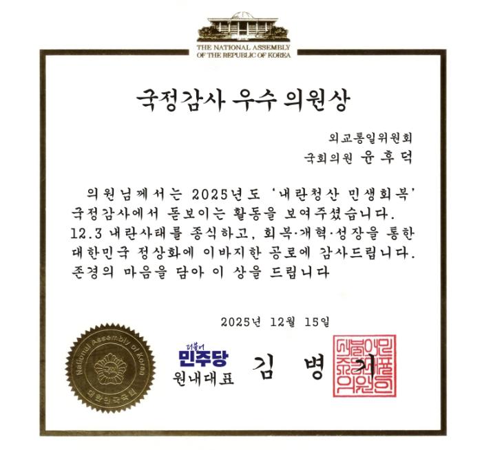 더불어민주당 윤후덕 국회의원(경기파주시갑·외교통일위원회)은 '2025 더불어민주당 국정감사 우수의원상'을 수상했다고 19일 밝혔다.