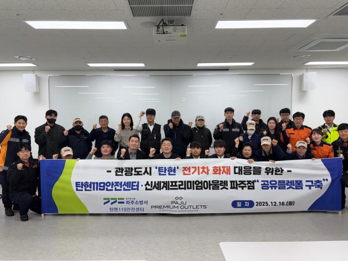 파주소방서 탄현119안전센터(센터장 주성룡)는 16일 신세계사이먼 파주 프리미엄아울렛과 함께 탄현면 관광단지 내 전기차 화재에 신속 대응하기 위한 화재진압 장비 ‘공유플랫폼’을 구축했다.