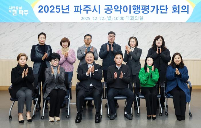 • 파주시는 지난 22일 ‘2025 파주시 공약이행평가단 회의’를 개최한 결과, 2025년 말 현재 민선 8기 파주시의 공약 이행률 79.86%를 달성했다고 밝혔다.