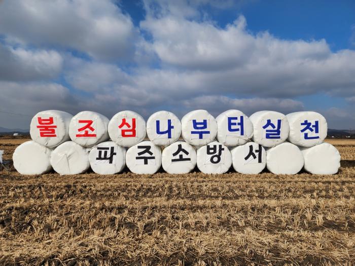 파주는 도농복합지역으로, 논밭과 목초지 등 농촌 경관이 넓게 펼쳐져 있다. 이러한 지역적 특성을 살려, 건초나 사료를 저장할 때 사용하는 둥근 비닐 포장재인 곤포사일리지에 「불조심 나부터 실천」이라는 문구를 삽입하고 자유로변에 설치해, 운전자들에게 자연스럽게 화재예방 메시지를 전달하고 있다.