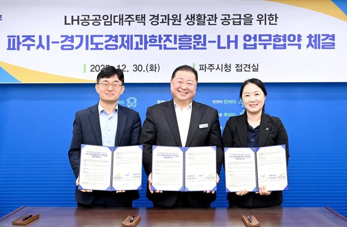 파주시는 30일 경기도경제과학진흥원(이하 ‘경과원’), 한국토지주택공사 경기북부지역본부(이하 ‘한국토지주택공사’)와 경과원 파주시 이전에 따른 엘에이치(LH) 공공임대주택 생활관 지원을 위한 업무협약을 체결했다고 밝혔다.