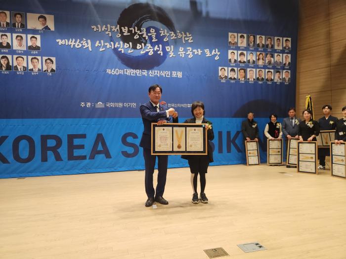@ 제60회 대한민국 신지식인 포럼에서 강희정 씨가 K-FOOD 신지식인 인증패를 수여받고 있다.