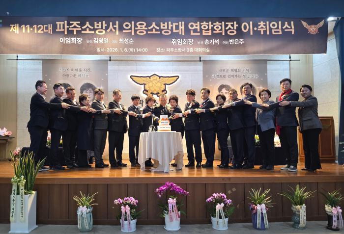 파주소방서(서장 김명찬)는 1월 6일 오후 파주소방서 3층 대회의실에서 제11‧12대 의용소방대 연합회장 이‧취임식 개최했다. 이번 행사는 지역사회를 위해 헌신해 온 이임 회장들의 노고를 기리고, 새롭게 출범하는 신임 회장단을 축하하기 위해 마련됐다.