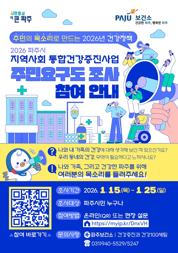 파주시는 시민의 건강한 삶을 지원하기 위해 ‘2026년 지역사회 통합건강증진사업’ 추진에 앞서 주민건강요구도 조사를 실시한다.