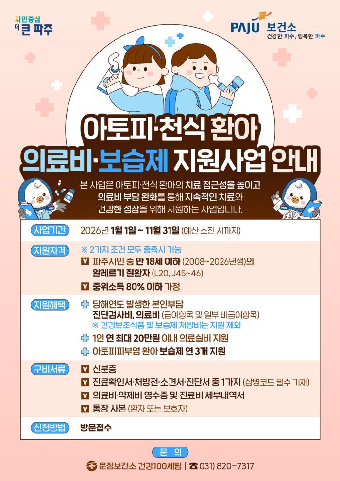 파주시 운정보건소는 아토피피부염과 천식 등 알레르기질환을 앓고 있는 환아의 건강한 성장과 보호자의 의료비 부담 완화를 위해 ‘아토피·천식 환아 지원사업’을 연중 운영하고 있다.