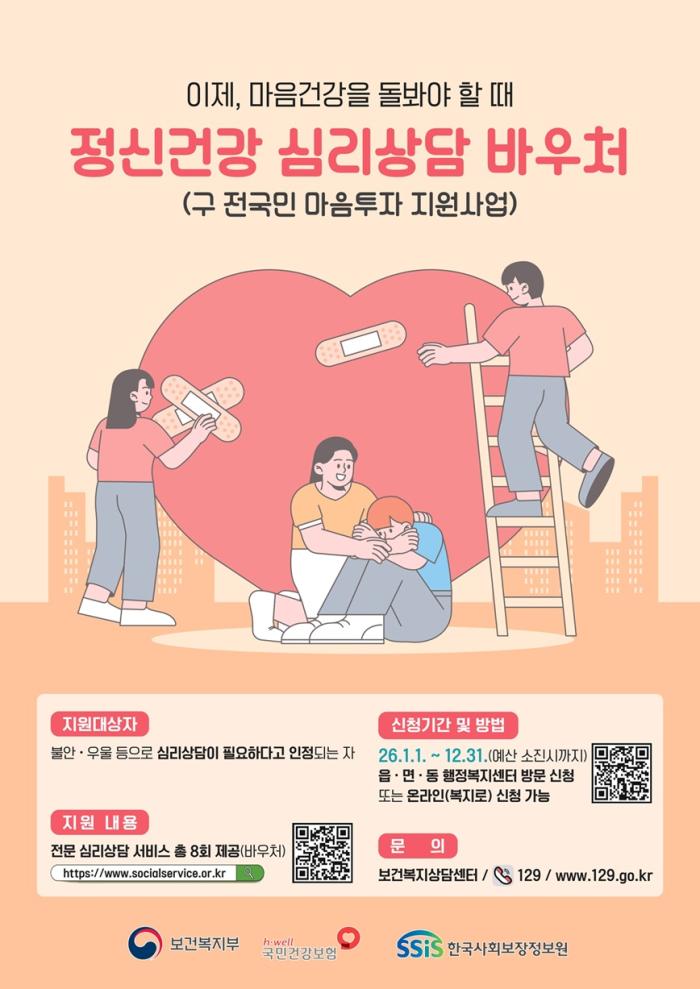 ‘정신건강 심리상담 바우처사업’은 2024년부터 시행 중인 ‘전국민 마음투자 지원사업’의 명칭을 변경해 운영하는 사업으로, 우울·불안 등 정서적 어려움을 겪는 시민에게 120일간 총 8회의 대화 기반 전문 심리상담 서비스를 제공하는 사업이다.