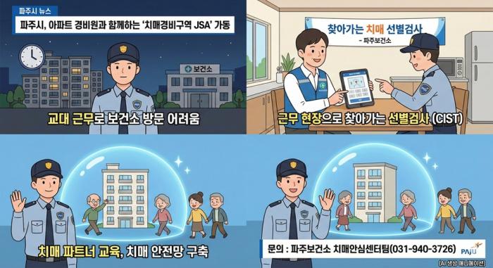 파주시는 오는 2월부터 관내 아파트 단지 경비원을 대상으로 찾아가는 치매 조기 검진 및 예방 프로그램인 ‘치매경비구역 제이에스에이(JSA)’ 사업을 본격 추진한다고 밝혔다.