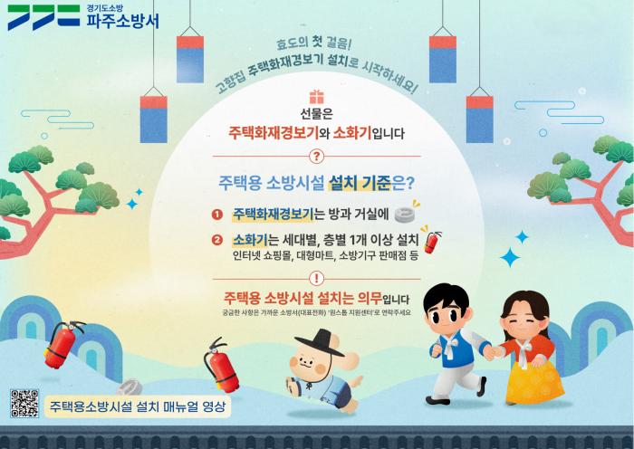 파주소방서는 설 명절을 맞아 ‘주택용 소방시설 설치하기’ 홍보를 집중 추진하고 있으며, 최근 파주시에서 시민이 소화기를 활용하여 화재를 자체 진화한 사례가 발생해 주택용 소방시설의 중요성이 다시금 주목받고 있다.