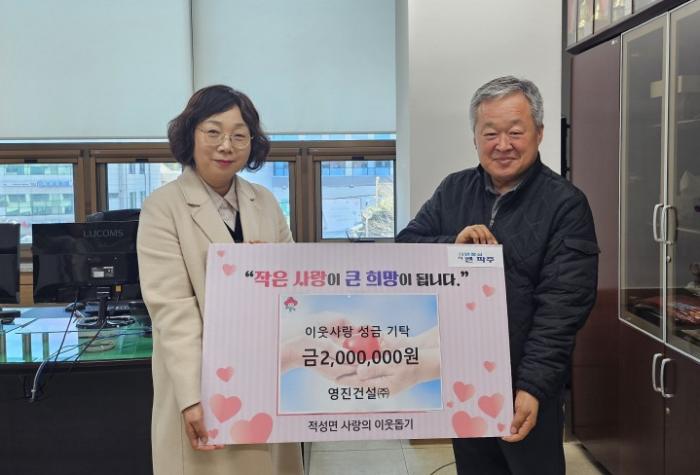 기탁된 성금과 물품은 적성면 지역사회보장협의체(민간위원장 이진우) 등을 통해 관내 독거노인, 장애인, 저소득 한부모 가정 등 도움이 필요한 이웃들에게 전달될 예정이다.