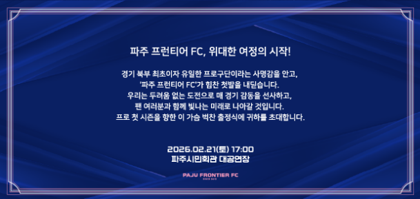 파주 축구의 지형을 바꿀 새로운 시대가 막을 올린다. 경기 북부 최초의 프로축구단으로 도약한 파주 프런티어 FC가 오는 2월 21일 오후 5시, 파주시민회관 대공연장에서 2026 시즌 공식 출정식을 개최하고 프로 무대를 향한 담대한 항해를 시작한다.
