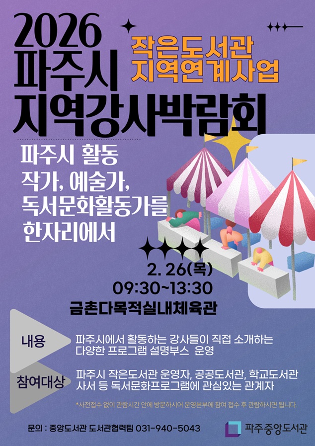 파주시 중앙도서관은 오는 26일 9시부터 금촌다목적실내체육관에서 ‘2026 파주시지역강사박람회’를 개최한다.