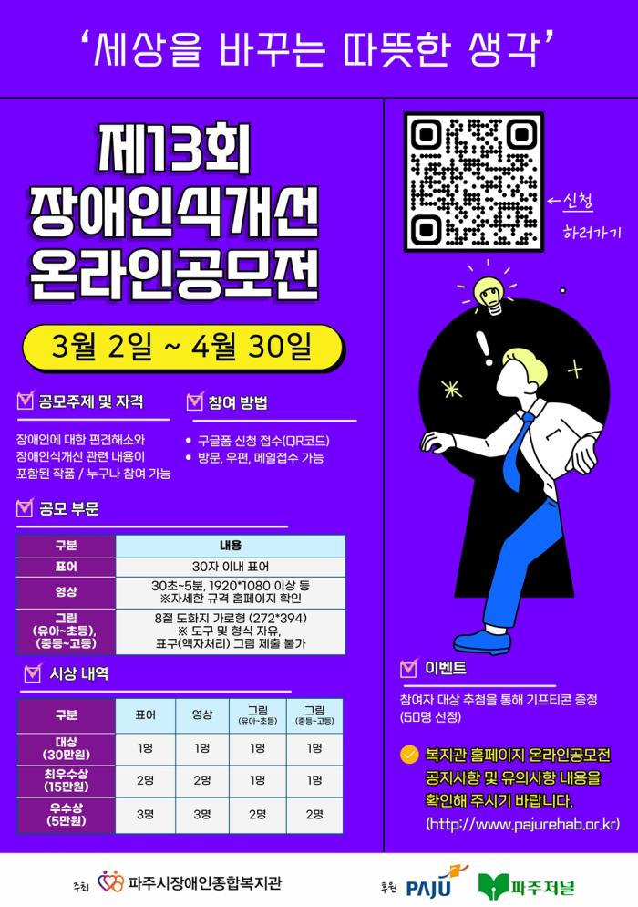 파주시장애인종합복지관(관장 홍정숙)은 장애인의날 45주년 기념 및 지역사회의 올바른 장애인식 제고를 위해 ‘제13회 장애인식개선 온라인 공모전’을 개최한다고 밝혔다.