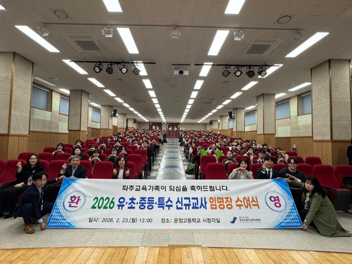 경기도파주교육지원청(교육장 전선아)은 23일(월) 오후, 경기도파주교육지원청 주관으로 운정고등학교 시청각실에서 ‘2026. 3. 1.자 유‧초‧중등‧특수‧비교과 신규교사 임명장 수여식’을 개최하고 총 189명의 신규교사에게 임명장을 수여했다.