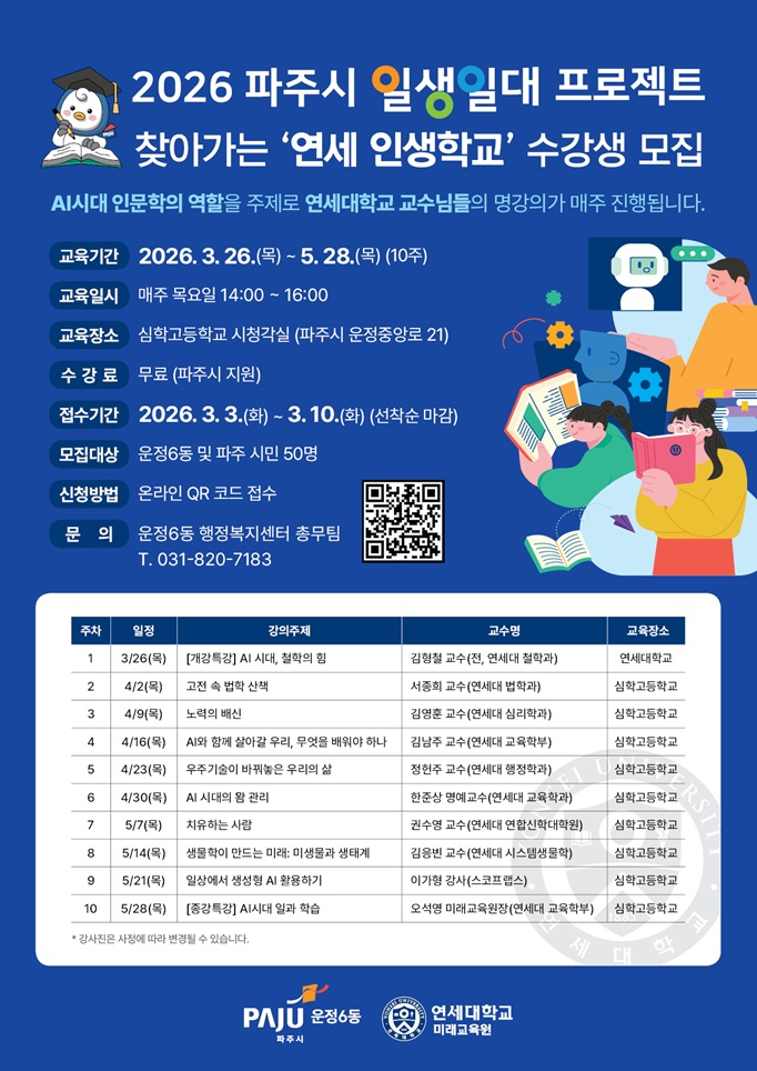 ‘일생일대 프로젝트’는 파주시가 전국 최초로 시도하는 혁신적 평생학습 모델로, 행정 중심의 교육에서 벗어나 주민 생활권 내에서 명문대학 수준의 고등교육을 직접 향유할 수 있도록 기획됐다. 특히 올해는 국내 최고 수준의 교육 역량을 보유한 연세대학교 미래교육원이 참여해 교육의 깊이와 질을 한 차원 더 높였다.