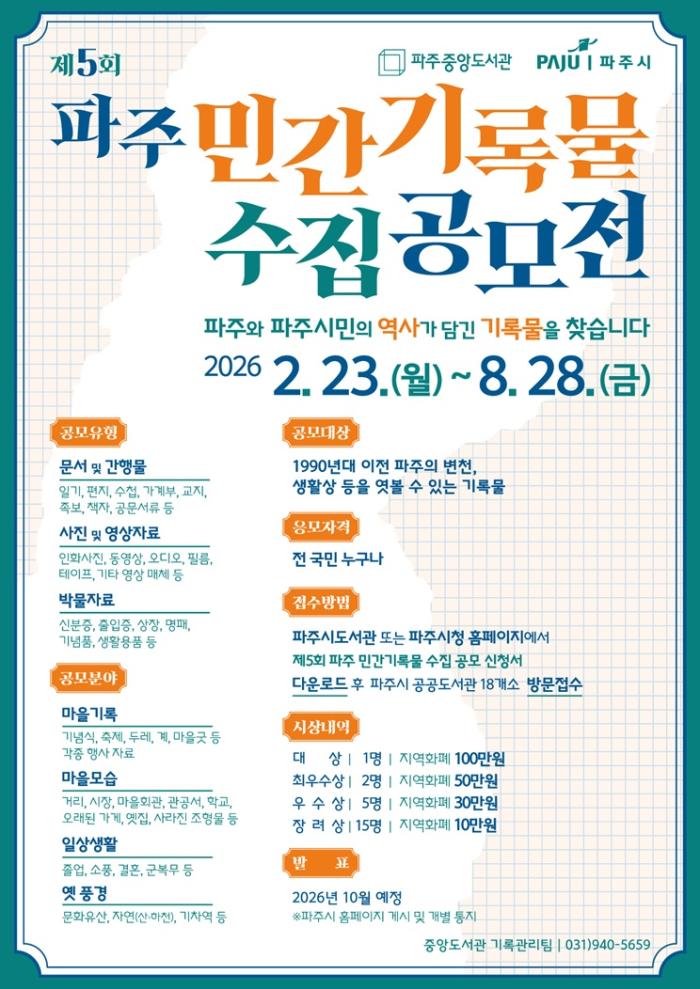 파주시 중앙도서관은 시민의 삶 속에 남아 있는 기록을 통해 지역의 역사를 되살리고자 2월 23일부터 8월 28일까지 ‘제5회 파주 민간기록물 수집 공모전’을 개최한다.