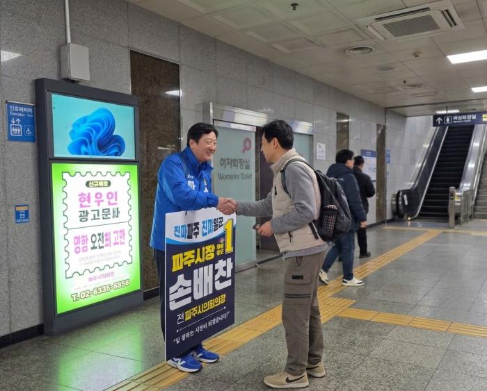 손배찬 파주시장 예비후보는 4일 오전 문산역에서 출근길 시민 인사를 하며, 파주를 ‘한반도 평화경제의 수도’로 만들겠다는 강력한 의지를 표명했다. 손 예비후보는 이란 전쟁 등 글로벌 초불확실성 시대를 맞아, 파주는 평화를 통해 경제적 활로를 찾아야 한다고 강조했다.
