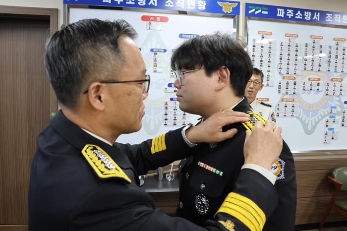 김명찬 파주소방서장은 “승진은 개인의 노력뿐 아니라 시민 안전을 위해 묵묵히 헌신해 온 시간의 결과”라며 “앞으로도 각자의 자리에서 전문성과 책임감을 바탕으로 시민의 생명과 안전을 지키는 역할을 충실히 해주길 바란다”고 말했다.