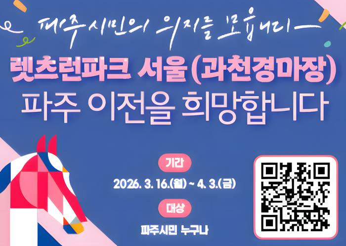 파주시는 지난 2월 운정 지역 주민들의 의견을 반영해 과천 경마공원 파주 유치 의사를 밝힌 바 있으며, 일부 시민단체와 주민들을 중심으로 이전 유치를 지지하는 온·오프라인 서명운동도 진행되고 있다.