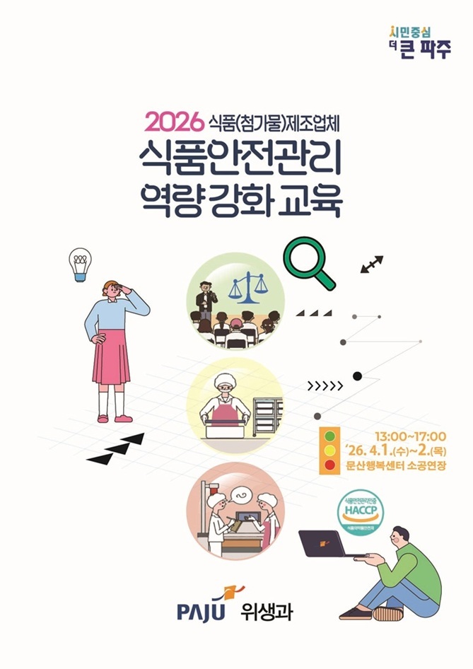 파주시는 관내 식품(첨가물)제조업체 영업자 및 종사자를 대상으로 ‘2026년 식품안전관리 역량 강화 교육’ 참여업체를 모집한다.