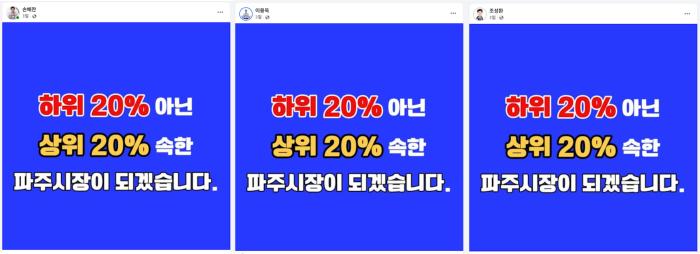 ▲ '하위 20%' 정조준 (2026.03.22.) 경선이 중반부로 치닫자 3인의 후보가 약속이라도 한 듯 "하위 20% 아닌 상위 20% 속한 파주시장이 되겠습니다"라는 문구가 담긴 동일한 이미지를 동시에 게시했다.