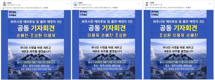 ▲ 공동 대응의 서막 (2026.03.11.) 손배찬·이용욱·조성환 등 더불어민주당 파주시장 예비후보 3인이 각자의 SNS에 동일한 디자인의 포스터를 게재하며 공동 행동을 공식화했다.