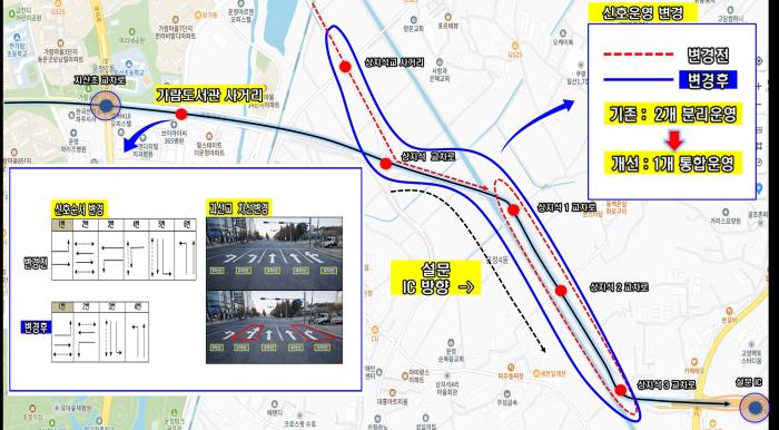 아울러 상지석 교차로부터 설문나들목(IC) 구간까지는 기존 2개로 운영되던 신호 연동체계를 1개 그룹으로 통합하여 출근시간에는 나들목(IC) 방향, 퇴근시간에는 신도시 방향 중심으로 교통 흐름이 원활히 유지되도록 최적화할 방침이다.