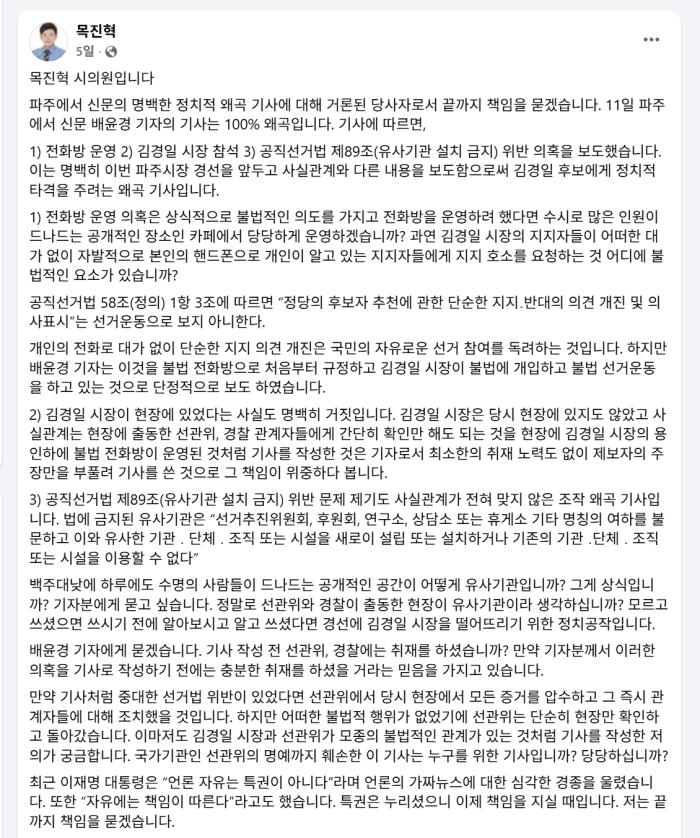 ▲ 목진혁 파주시의원이 자신의 페이스북을 통해 사실관계를 바로잡고 강력한 법적 대응 의지를 밝힌 게시물(4월 11일 페이스북 캡처)