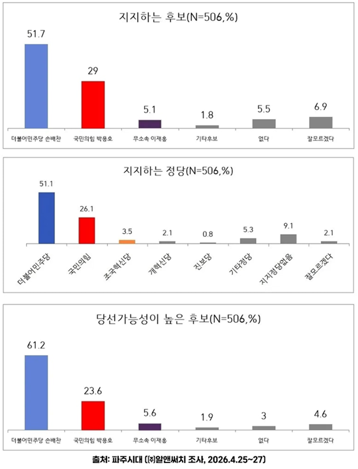 더불어민주당 파주시장 후보 확정 이후 실시된 첫 여론조사에서 손배찬 후보가 51.7%의 지지율로 과반을 넘기며 1위를 기록한 것으로 나타났다.