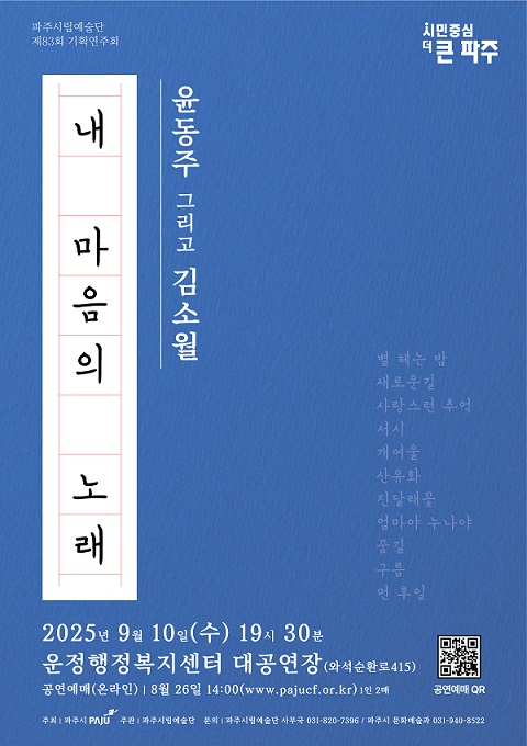 파주시는 오는 910일 오후 730, 운정행복센터 대공연장에서 시립예술단 제83회 기획연주회 내 마음의 노래 <윤동주 그리고 김소월>‘를 개최한다고 밝혔다.