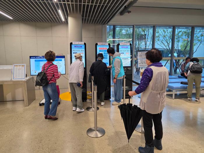 | @봉사원들이 키오스크 사용법을 도와주고 있다. 많은 사람들이 이용하고 있는 모습▲ 하효종 기자