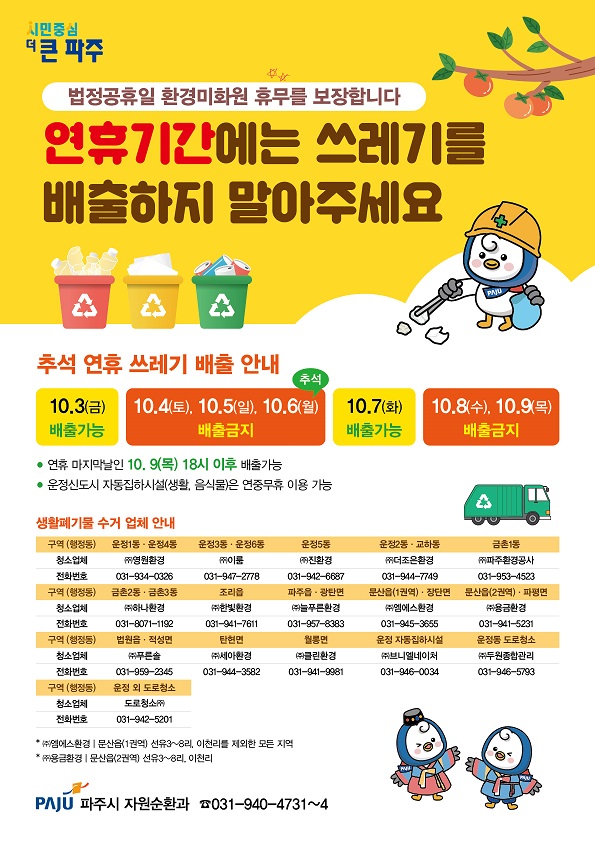파주시는 환경미화원 휴무 보장을 위해 추석 연휴 기간인 104일부터 106, 108일부터 109일까지는 생활폐기물을 배출해서는 안 되며, 이 기간 동안에는 생활쓰레기 수거가 중단된다고 밝혔다.
