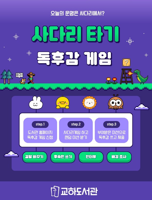 파주시 교하도서관은 오는 10월 2일부터 11월 30일까지, 게임형 독후감 미션을 접목한 독서진흥 프로그램 ‘독후감 게임’을 운영한다.