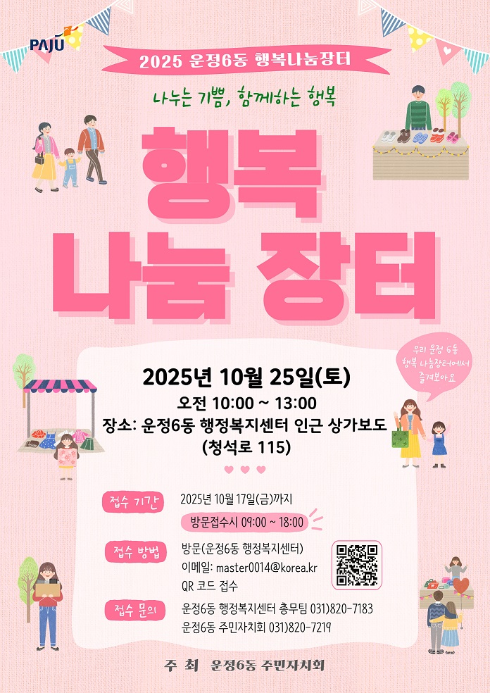 파주시 운정6동 주민자치회는 오는 2510시부터 13시까지 운정6동 행정복지센터 앞에서 주민과 함께하는 3회 행복나눔장터를 개최한다.