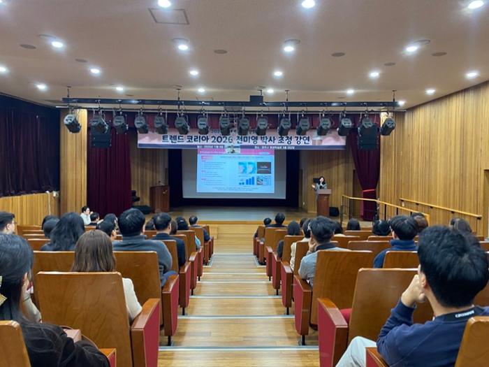 이번 강연에서 전 강사는 「트렌드코리아 2026」의 주요 내용을 중심으로, 인공지능(AI) 대전환 시대의 사회 변화와 소비 흐름을 소개하며 기술 발전 속에서도 인간 중심의 시각과 균형 있는 대응의 중요성을 설명했다.