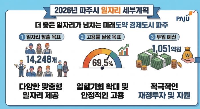 파주시는 2026년 ’일자리 1만 4,248개 창출‘과 ’고용률 69.5% 달성‘을 위해 1,051억 원의 예산을 투입하는 일자리 대책 세부계획을 수립·공시했다.